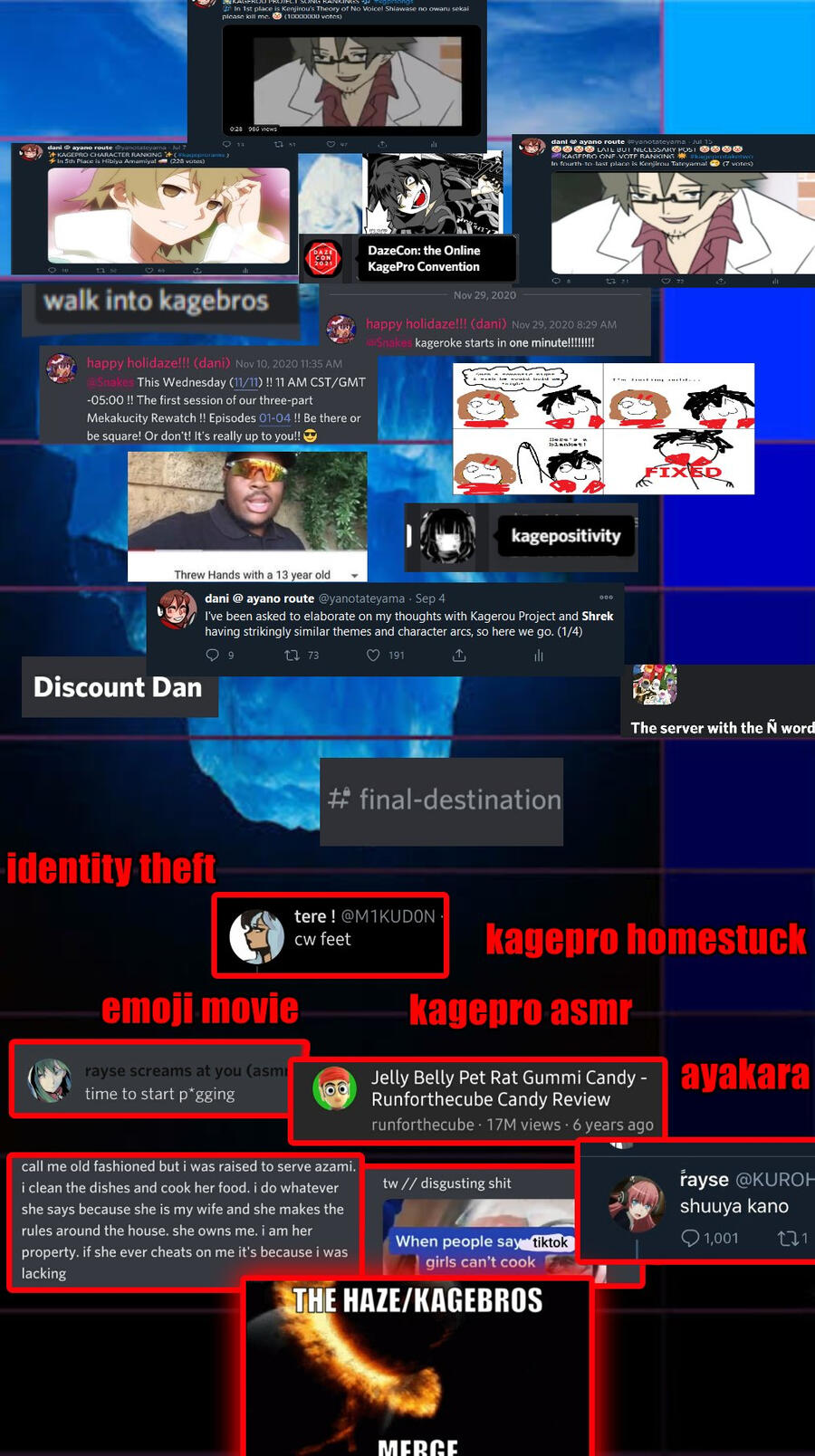 okay actually speaking though the people here are really funny and kind and this server even made me discover some of my closest friends!! the moderation team is really nice and theres barely any drama or anything like that in the server or pretty much the whole fandom :D also its a good place to hang out since almost half of the current kagepro fandom is in here from what ive seen... good sides of having a small community? we also have a kagepro rp server called discount dan where we rp as our ocs!! i got closer to a lot of people there and its been really fun even though its not that active recently ^^ i also really love the shitposts and art that is made here there are so many talented people... and some of them even made me become more open about my interests without being ashamed of it :') so yeah would recommend joining, we got the epic people here and i would love to make friends with other kagepro fans as well!! - daisyKagebros server, 10/10. 6 stars. Off the charts. I like this server very much, everyone is nice. I didn't expect to find a server from this dead fandom, and I wish I didn't. Now I regret joining this server after staying for a few months, this server made me question my sanity and it fucked up my sleeping schedule. I now sleep for 4-5 hours ever since I joined. I hate this server. I am becoming more mentally ill by talking in this server. Everyone is VERY cursed. There are also so many talented artists, but unfortunately, they use their talent to create stupid shitposts. Use your talent to create something amazing, please. So over that, I'd rate it a 2/10. BUT, I like this one specific channel. The AU channel. I met a lot of great artists, and writers too. They inspired me a lot and motivated me more to draw. Thanks for that. So discount dan, 10/10...until Jaydnn joined. It goes back to 5/10. She ruined my peaceful life in the discount dan. Now I want to leave there too. And my close friends in this server are also bullying me recently, I want to leave this hell so bad. From time to time too, I get in a Floppa VS Bingus discourse too. Fuck you. But I'm leaving a 10/10 in this server, I got my exie in here. Thank you for this stupid fucking server. - rayseINTRODUCTION